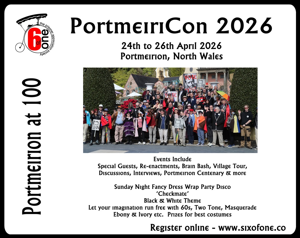 Six of One holds its annual Prisoner Convention - known as Portmeiricon - in Portmeirion Village. Six of One is the only Prisoner appreciation society recognised by Portmeirion and we remain grateful to be able to hold our annual event in The Prisoner's original setting.