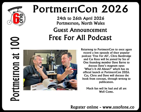 Conventions are self-financing and the organisation, preparation, setting up and running of the event each year is done on a voluntary basis, provided by a dedicated group of people. Conventions are for members and are always promoted and run in a very friendly atmosphere. Six of One would like to thank Portmeirion and all their staff for all of their support and the continued success of Portmeiricon.